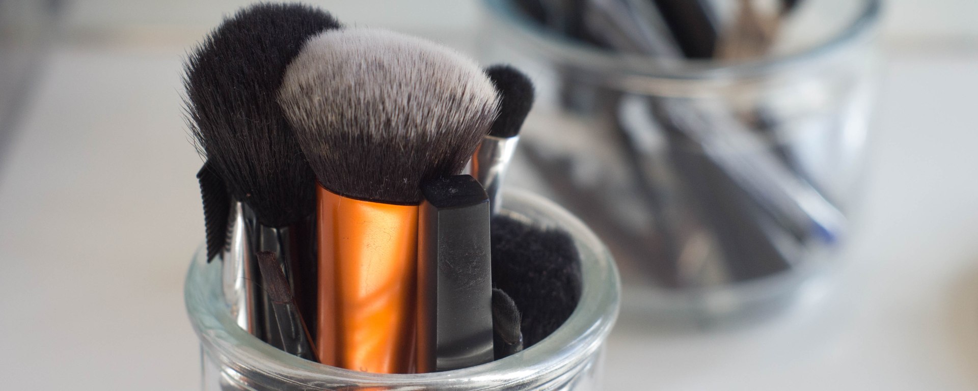 Utiliza frascos de velas aromáticas para organizarlas. Yo tengo en un más fino las brochas para los ojos y en uno pequeño, las brocas más grandes (de rostro) y mis delineadores en lápiz.